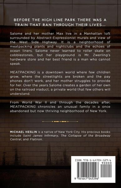 Before the High Line Park there was a train that ran through their lives... Salome and her mother Max live in a Manhattan loft surrounded by Abstract Expressionist murals and views of the West Side Highway. It is a neighborhood of meatpacking plants and nightclubs and the echoes of ocean liners. Salome never learned to roller skate on cobblestones, but her playground is Mr. Zwerling's hardware store and her best friend is a man who cannot speak. MEATPACKING is a downtown world where few children grow, where the streetlights are broken and the pay phones don't work, and her mother struggles to provide for her. Over the years Salome creates a garden of her own on the railroad viaduct, a private world that few others will understand. From World War II and the decades after, MEATPACKING chronicles an unusual family in a once abandoned but now thriving neighborhood of New York.