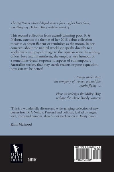 In this second collection from award-winning poet, K A Nelson, extends the themes in her 2018 debut collection, to write as desert flâneur or reminisce as the moon. In her concerns about the natural world she speaks directly to a kookaburra and pays homage to the riparian zone. In writing of loss, love and its antithesis, she employs wry humour or a sometimes-brutal response to aspects of contemporary Australian society that may startle readers or pose a question: how can we be better?