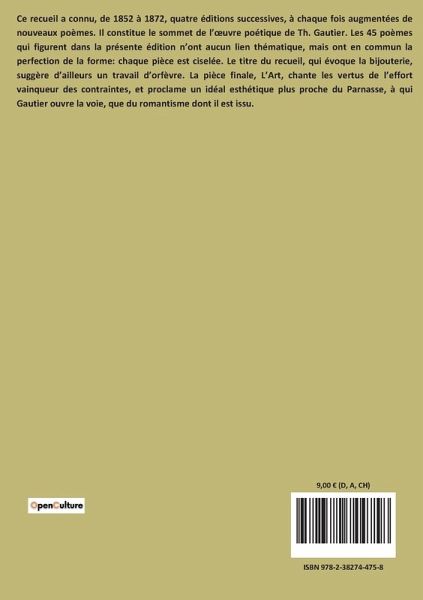 Ce recueil a connu, de 1852 à 1872, quatre éditions successives, à chaque fois augmentées de nouveaux poèmes. Il constitue le sommet de l¿¿uvre poétique de Th. Gautier. Les 45 poèmes qui figurent dans la présente édition n¿ont aucun lien thématique, mais ont en commun la perfection de la forme: chaque pièce est ciselée. Le titre du recueil, qui évoque la bijouterie, suggère d¿ailleurs un travail d¿orfèvre. La pièce finale, L¿Art, chante les vertus de l¿effort vainqueur des contraintes, et proclame un idéal esthétique plus proche du Parnasse, à qui Gautier ouvre la voie, que du romantisme dont il est issu.