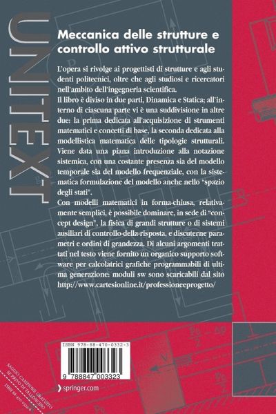 Dinamica 1.- Dinamica di componenti e sistemi.- Oscillatore multimodale ad inerzia ed elasticità concentrate.- L'oscillatore multimodale ad inerzia ed elasticità distribuite.- Analisi modale nel dominio delle frequenze. Identificazione.- Dinamica 2.- Edifici: modellistica. Controllo della risposta.- Ponti di grande luce: modellistica. Controllo della risposta.- Camini: modellistica. Controllo della risposta.- Controllo di vibrazioni con smorzatori inerziali.- Statica 1.- Statica del corpo rigido piano.- Baricentri. Inerzie.- Introduzione alla teoria dei continui elastici.- Statica 2.- Il solido di de Saint Venant. Applicazioni: acciaio e calcestruzzo armato.- Travi. Travature reticolari. Quadri di teoria e utilità di calcolo.- Archi.- Funi.- Piastre.- Volte sottili in regime di membrana.- Appendici.- Appendice:cheda STA-3.- Rapporti tra scienze e ingegneria tra XVIII e XX secolo. Gli sviluppi dell'automatica nel XX secolo.