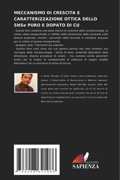 - Questo libro contiene una parte storica di revisione delle nanotecnologie, la sintesi delle nanoparticelle e l'effetto della dimensione delle particelle sulle diverse proprietà, nonché i parametri delle tecniche in soluzione acquosa per la sintesi di queste nanoparticelle. - Vengono citati i riferimenti più autentici. - Questo libro sarà unico nel suo genere perché non solo contiene una rassegna delle nanotecnologie - teoria di base, proprietà dipendenti dalle dimensioni, diverse procedure di sintesi - ma contiene anche parametri pratici per la sintesi di nanoparticelle di seleniuro di stagno studiati dall'autore con un processo di prova ed errore.