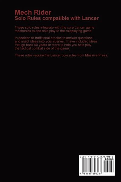 Mech RiderSolo Rules compatible with Lancer These solo rules integrate with the core Lancer game mechanics to add solo play to the roleplaying game. In addition to traditional oracles to answer questions and inject ideas into your scenes, I have included ideas that go back 60 years or more to help you solo play the tactical combat side of the game. These rules require the Lancer core rules from Massive Press. Solo rules make an excellent tool to help you quickstart your way into a new game.