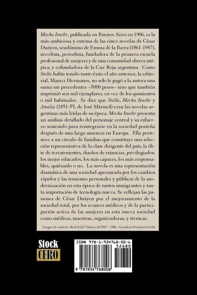Mecha Iturbe, published in Buenos Aires in 1906, is the most ambitious and longest of César Duáyen's five novels about the transformation of Argentina into a contemporary state in the early part of the 20th century. César Duáyen, pseudonym of Emma de la Barra (1861-1947), was the author of Argentina's best seller, Stella of 1905, and Mecha Iturbe, too, was greeted with great excitement. A record number of copies were printed, and the author was paid an unprecedented amount. There were many editions, but none has been available in recent years. In Mecha Iturbe, elements of national reform and modernization are portrayed and debated in an even more complicated failed love story, also set in both Buenos Aires (drawing rooms, congress, the opera, a labor union rally) and in a utopian factory town. The central character, Mecha Iturbe, has just come from Europe so Argentina must be explained to her, and shown to her. But Mecha, from whose point of view everything is seen, is a very traditional Argentine-born woman who resists modernization --she likes being an upper class, affluent, Catholic conservative, she likes organizing charity balls and buying fashionable new clothes-- and who has the misfortune to fall in love with a reform-minded, idealistic medical doctor who expects her to want to change and improve Argentina. The other major woman character is a surgeon, who eventually marries an up and coming politician and labor leader, but continues to practice medicine. With a prologue and notes by Mary G. Berg, this novel would be a discussion-provoking addition to any class on Argentine, Southern Cone or Latin American 20th century history, women's studies, or literature