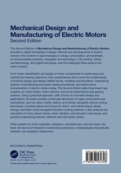 This Second Edition of Mechanical Design and Manufacturing of Electric Motors provides in-depth knowledge of design methods and developments of electric motors in the context of rapid increases in energy consumption, and emphasis on environmental protection, alongside new technology in 3D printing, robots, nanotechnology, and digital techniques, and the challenges these pose to the motor industry.