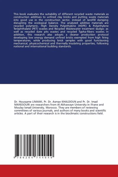 This book evaluates the suitability of different recycled waste materials as construction additives to unfired clay bricks and putting waste materials into good use in the construction sector, instead of landfill damping disrupting the ecological balance. The analyzed additive materials are recycled polymeric, High Density Polyethylene (HDPE) & Polyethylene Terephthalate (PET) wastes and Recycled Wastewater treatment sludge; as well as recycled date pits wastes and recycled Typha-Fibers wastes. In addition, this research also adopts a cleaner production protocol developing low energy demand unfired bricks exempted from high firing temperatures, while producing brick samples with good functioning mechanical, physicochemical and thermally insulating properties, following national and international building standards.