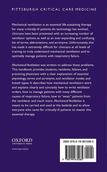 Mechanical ventilation is an essential life-sustaining therapy for many critically-ill patients. As technology has evolved, clinicians have been presented with an increasing number of ventilator options as well as an ever-expanding and confusing list of terms, abbreviations, and acronyms. Unfortunately, this has made it extremely difficult for clinicians at all levels of training to truly understand mechanical ventilation and to optimally manage patients with respiratory failure. Mechanical Ventilation was written to address these problems. This handbook provides students, residents, fellows, and practicing physicians with a clear explanation of essential physiology, terms and acronyms, and ventilator modes and breath types. It describes how mechanical ventilators work and explains clearly and concisely how to write ventilator orders, how to manage patients with many different causes of respiratory failure, how to "wean" patients from the ventilator, and much more. Mechanical Ventilation is meant to be carried and used at the bedside and to allow everyone who cares for critically-ill patients to master this essential therapy.