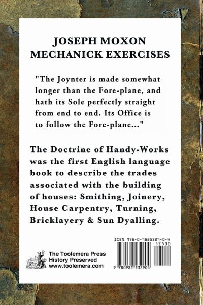 Mechanick Exercises: Or The Doctrine Of Handy-Works, was written, printed and published by Joseph Moxon between 1683 & 1685 and reprinted in 1703. Breaking away from Guild restrictions, Moxon wrote of what he knew from his experiences as a practitioner of skilled trades. A mathematician, writer, printer, publisher and maker of maps, globes and scientific instruments, Joseph Moxon was also the first tradesman to be awarded membership in the Royal Society of London. Mechanick Exercises popularized the secrets of the skilled trades of Smithing, Joinery, House Carpentry, Turning and Bricklaying, along with the making of Sun Dials. Mechanick Exercises is as important a reference today as a description of early skilled trades as it was in the 17th, 18th and 19th centuries.