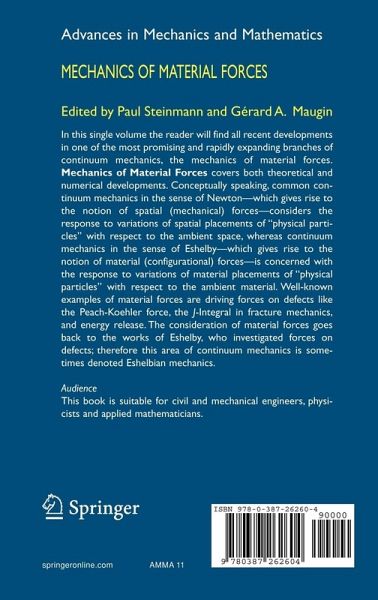 This book covers new theoretical and numerical developments in the mechanics of material forces. Conceptually speaking, common continuum mechanics in the sense of Newton - which gives rise to the notion of spatial (mechanical) forces - considers the response to variations of spatial placements of "physical particles" with respect to the ambient space, whereas continuum mechanics in the sense of Eshelby - which gives rise to the notion of material (configurational) forces - is concerned with the response to variations of material placements of "physical particles" with respect to the ambient material. Well-known examples of material forces are driving forces on defects like the Peach-Koehler force, the J-Integral in fracture mechanics, and energy release. The consideration of material forces goes back to the works of Eshelby, who investigated forces on defects; therefore this area of continuum mechanics is sometimes denoted Eshelbian mechanics.