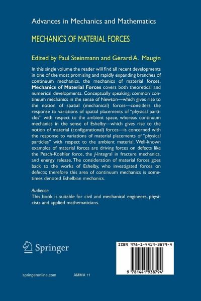 4d Formalism.- On Establishing Balance and Conservation Laws in Elastodynamics.- From Mathematical Physics to Engineering Science.- Evolving Interfaces.- The Unifying Nature of the Configurational Force Balance.- Generalized Stefan Models.- Explicit Kinetic Relation from "First Principles".- Growth & Biomechanics.- Surface and Bulk Growth Unified.- Mechanical and Thermodynamical Modelling of Tissue Growth Using Domain Derivation Techniques.- Material Forces in the Context of Biotissue Remodelling.- Numerical Aspects.- Error-Controlled Adaptive Finite Element Methods in Nonlinear Elastic Fracture Mechanics.- Material Force Method. Continuum Damage & Thermo-Hyperelasticity.- Discrete Material Forces in the Finite Element Method.- Computational Spatial and Material Settings of Continuum Mechanics. An Arbitrary Lagrangian Eulerian Formulation.- Dislocations & Peach-Koehler-Forces.- Self-Driven continuous Dislocations and Growth.- Role of the Non-Riemannian Plastic Connection in Finite Elasto-Plasticity with Continuous Distribution of Dislocations.- Peach-Koehler Forces within the Theory of Nonlocal Elasticity.- Multiphysics & Microstructure.- On the Material Energy-Momentum Tensor in Electrostatics and Magnetostatics.- Continuum Thermodynamic and Variational Models for Continua with Microstructure and Material Inhomogeneity.- A Crystal Structure-Based Eigentransformation and its Work-Conjugate Material Stress.- Fracture & Structural Optimization.- Teaching Fracture Mechanics Within the Theory of Strength-of-Materials.- Configurational Thermomech-Anics and Crack Driving Forces.- Structural Optimization by Material Forces.- On Structural Optimisation and Configurational Mechanics.- Path Integrals.- Configurational Forces and the Propagation of a CircularCrack in an Elastic Body.- Thermoplastic M Integral and Path Domain Dependence.- Delamination & Discontinuities.- Peeling Tapes.- Stability and Bifurcation with Moving Discontinuities.- On Fracture Modelling Based on Inverse Strong Discontinuities.- Interfaces & Phase Transition.- Maxwell's Relation for Isotropic Bodies.- Driving Force in Simulation of Phase Transition Front Propagation.- Modeling of the Thermal Treatment of Steel With Phase Changes.- Plasticity & Damage.- Configurational Stress Tensor in Anisotropic Ductile Continuum Damage Mechanics.- Some Class of SG Continuum Models to Connect Various Length Scales in Plastic Deformation.- Weakly Nonlocal Theories of Damage and Plasticity Based on Balance of Dissipative Material Forces.