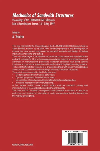 General Lectures.- Classification of structural sandwich panel behaviour.- The development of sandwich structures for naval vessels during 25 years.- Damage tolerance of aeronautical sandwich structures.- Modeling of the crash behaviour of edge loaded sandwich structures with fibre reinforced polymer faces.- Contributions.- A comparative analysis of some theories and finite elements for sandwich plates and shells.- Static analysis of sandwich plates by finite elements.- A refined multilayered FEM model applied to sandwich structures.- A refined shear-deformation sandwich finite element.- Comparison of three shear-deformation theories in the non-linear analysis of sandwich shell elements.- On shear and bending membrane coupling in sandwich shells with elastic or viscoelastic core.- Bending, buckling and free vibration of sandwich composite beams with a transverse shear stress continuity model.- Stress distribution in a 4-point or 3-point bending probe.- Saint-Venant's principle for sandwich structures.- Membrane analogy for sandwich panels in thermally or piezoelectrically induced bending.- Homogenization of periodic sandwiches.- Characterization and simulation of the mechanical behaviour of multilayered components composing a fibrous cylinder head gasket.- Prediction of elastic properties of sandwich panels using a homogenization computational model.- Effects of boundary conditions in high-order buckling of sandwich panels with transversely flexible core.- A study on the influence of local buckling on the strength of structural core sandwich structures.- Boundary effects and local stability of sandwich panels.- Overall behaviour of laterally loaded shallow sandwich panels.- Geometric non-linear analysis of sandwich structures.- Plastic interface stability inbimetallic layers subjected to biaxial loading.- Dynamic behaviour of sandwich structures used in air transport.- Identification of the dynamic material properties of composite sandwich panels with a mixed numerical experimental technique.- New elastodynamic solutions to forced vibration problems of layered rectangular viscoelastic plates.- Theory for small mass impact on sandwich panels.- Effect of ballistic impact on the compression behaviour of carbon/glass hybrid composite sandwich panels for military bridging structures.- Penetrating impact strength of sandwich panels-meaningful test method and simplified prediction.- Contribution of the response surface methodology to the study of low velocity impact on sandwich structures.- Energy absorption characteristics of a foam-cored sandwich panel with fibre-reinforced plastic inserts.- Theoretical and experimental analysis of dissymmetrical sandwich plates with compressible core.- Viscoelastic properties of steel/polymer/steel sandwich structures.- Bending fatigue behaviour of PUR-epoxy and phenolic 3D woven sandwich composites.- Characterization of the mechanical behavior of wood laminates with the help of a flexion-compression device.- Applying the grid method to the measurement of displacement and strain fields through the thickness of a sandwich beam.- Moisture detection in sandwich plates using infrared thermography under microwave excitation.- Modelling of the core properties of sandwich-fabric panels with the help of finite elements.- Determination of material properties for structural sandwich calculations: from creep to impact loading.- Mechanical modelling and characterisation of a new structural filler made of small spheres assembly.- Experimental determination of the dynamic properties of a soft viscoelasticmaterial.- Recent developments in 3D-knittings for sandwich panels.- A new sandwich panel (skin in glass-carbon hybrid fabric/core in carbon mat): manufacturing and mechanical characteristics.- Sandwich panels for high speed airport shuttle.- Finite element aided design software for laminated and sandwich plates.- Genetic algorithm and performance indices applied to optimal design of sandwich structures.- Construction methods for big and heavy loaded fibre reinforced composite sandwich structures demonstrated on a Ses hull.- Sandwich plates with «Through-the-thickness» and «Fully potted»inserts.- Failure modes in sandwich T-joints.- List of Participants.