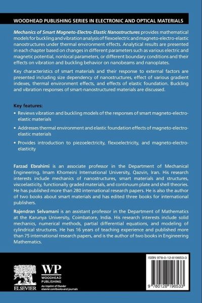 Mechanics of Smart Magneto-electro-elastic Nanostructures provides mathematical models for buckling and vibration analysis of flexoelectric and magneto-electro-elastic nanostructures under thermal environment effects. Analytical results are presented in each chapter based on changes in different parameters, including various electric and magnetic potential, non-local parameters or different boundary conditions and their effects on vibration and buckling behavior on nanobeams and nanoplates. Key characteristics of smart materials and their response to external factors are presented, including size-dependency of nanostructures, effect of various gradient indexes, thermal environment effects, and effects of elastic foundation.