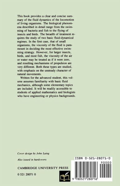 This book provides a clear and concise summary of the fluid dynamics of the locomotion of living organisms. The biological phenomena described in detail range from the swimming of bacteria and fish to the flying of insects and birds. The breadth of treatment requires the study of two basic fluid-dynamical regimes. In the first case, that of small organisms, the viscosity of the fluid is paramount in deciding the most effective swimming strategy. However, for larger insects, birds, and most fish, the viscosity of the air or water may be treated as if it were zero, and resulting mechanisms of propulsion are very different. Both these types are studied, with emphasis on the unsteady characters of natural movements. Written for the advanced student, this volume assumes familiarity with basic fluid mechanics, although some elementary topics are included. It will be readily accessible to students of applied mathematics and biologists who have engineering or physics backgrounds.