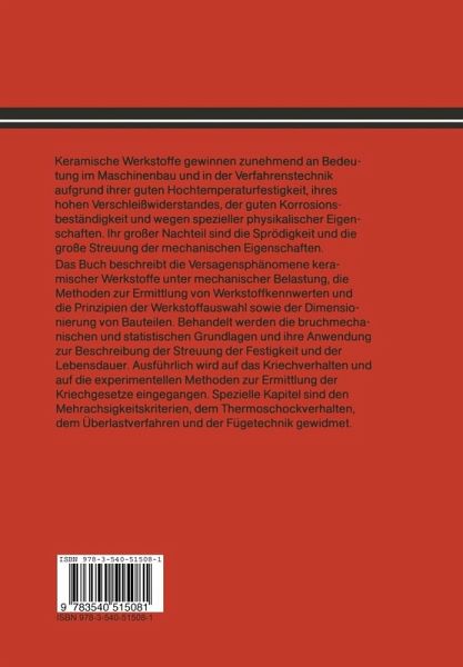 Keramische Werkstoffe gewinnen zunehmend an Bedeutung im Maschinenbau und in der Verfahrenstechnik aufgrund ihrer guten Hochtemperaturfestigkeit, ihres hohen Verschleißwiderstandes, der guten Korrosionsbeständigkeit und spezieller physikalischer Eigenschaften. Ihr großer Nachteil ist die Sprödigkeit und die große Streuung der mechanischen Eigenschaften. Das Buch beschreibt die Versagensphänomene keramischer Werkstoffe unter mechanischer Belastung, die Methoden zur Ermittlung von Werkstoffkennwerten und die Prinzipien der Werkstoffauswahl sowie der Dimensionierung von Bauteilen. Behandelt werden die bruchmechanischen und statistischen Grundlagen und ihre Anwendung zur Beschreibung der Streuung der Festigkeit und der Lebensdauer. Ausführlich wird auf das Kriechverhalten und auf die experimentellen Methoden zur Ermittlung der Kriechgesetze eingegangen. Spezielle Kapitel sind den Mehrachsigkeitskriterien, dem Thermoschockverhalten, dem Überlastverfahren und der Fügetechnik gewidmet.