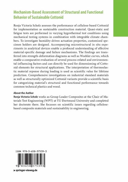 Ronja Victoria Scholz assesses the performance of cellulose-based Cottonid for implementation as sustainable construction material. Quasi-static and fatigue tests are performed in varying hygrothermal test conditions using mechanical testing systems in combination with integrable climate chambers. To investigate humidity-driven actuation properties, customized specimen holders are designed. Accompanying microstructural in situ experiments in analytical devices enable a profound understanding of effective material-specific damage and failure mechanisms. The findings are transferred into strength-deformation diagrams as well as Woehler curves, which enable a comparative evaluation of several process-related and environmental influencing factors and can directly be used for dimensioning of Cottonid elements for structural applications. The interpretation of thermoelastic material reponse during loading is used as scientific value for lifetime prediction. Comprehensive investigationson industrial standard materials as well as structurally optimized Cottonid variants provide a scientific basis for categorizing material's structural and functional performance towards common technical plastics and wood.