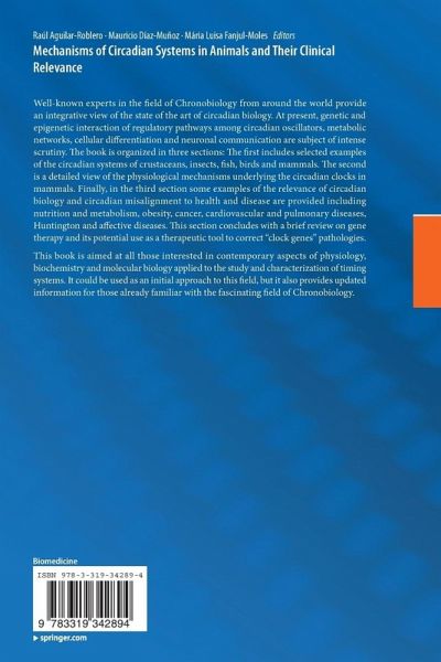 Well known experts in the field of Chronobiology from around the world, provide an integrative view of the state of the art of circadian biology. At present, genetic and epigenetic interaction of regulatory pathways among circadian oscillators, metabolic networks, cellular differentiation and neuronal communication are subject of intense scrutiny. The book is organized in three sections: The first includes selected examples of the circadian systems of crustaceans, insects, fish, birds and mammals. The second is a detailed view of the physiological mechanisms underlying the circadian clocks in mammals. Finally, in the third section some examples of the relevance of circadian biology and circadian misalignment to health and disease are provided including nutrition and metabolism, obesity, cancer, cardiovascular and pulmonary diseases, Huntington and affective diseases. This section concludes with a brief review on gene therapy and its potential use as a therapeutic tool to correct "clock genes" pathologies.