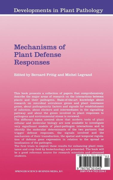 The different topics covered show that modern tools of plant cellular and molecular biology are now available to investigate very significant models of plant-pathogen interactions and to identify the molecular determinants of the two partners that trigger defence responses, the signals involved and the mechanism of their transduction, the spatial and temporal regulation of defence gene expression in relation to the spread or localization of the pathogen.