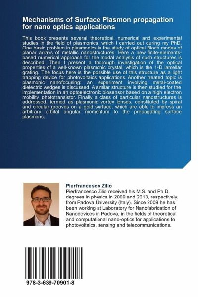 This book presents several theoretical, numerical and experimental studies in the field of plasmonics, which I carried out during my PhD. One basic problem in plasmonics is the study of optical Bloch modes of planar arrays of metallic nanostructures. Here a new finite-elements-based numerical approach for the modal analysis of such structures is described. Then I present a thorough investigation of the optical properties of a well-known plasmonic crystal, which is the 1-D lamellar grating. The focus here is the possible use of this structure as a light trapping device for photovoltaics applications. Another treated topic is plasmonic nanofocusing: an experiment involving metal-coated dielectric wedges is discussed. A similar structure is then studied for the implementation in an optoelectronic biosensor based on a high electron mobility phototransistor. Finally a class of particular nanostructures is addressed, termed as plasmonic vortex lenses, constituted by spiral and circulargrooves on a gold surface, which are able to impress an arbitrary orbital angular momentum to the propagating surface plasmons.