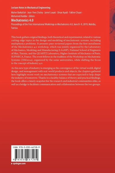 This book gathers original findings, both theoretical and experimental, related to various cutting-edge topics in the design and modeling of mechatronic systems, including multiphysics problems. It presents peer-reviewed papers from the first installment of the Mechatronics 4.0 workshop, which was jointly organized by the Laboratory of Mechanics, Modeling and Manufacturing (LA2MP), National School of Engineers of Sfax, Tunisia, and the QUARTZ Laboratory, Higher Institute of Mechanics of Paris, SUPMECA, France. The event follows in the tradition of the Workshop on Mechatronic Systems (JSM2014), organized by the same universities, while shifting the focus to the concept of Industry 4.0.