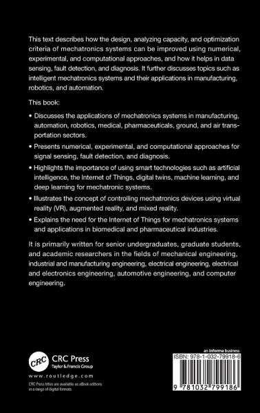 The text describes how the design, analyzing capacity, and optimization criteria of mechatronics systems can be improved using numerical, experimental, and computational approaches, and how it helps in data sensing, fault detection, and diagnosis.