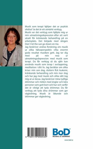 Musik som terapi hjälper det ur psykisk ohälsa? Ja det är ett utmärkt verktyg. Musik var det verktyg som hjälpte mig ur min utmattningsdepression efter att varit utsatt för kränkande behandling på en arbetsplats. Det började med sången Don t let the sun go down on me. Jag beskriver andras forskning om musik ur olika hälsoperspektiv vilka enormt goda resultat musiken gett. Jag tar dig med på min resa ur utmattningsdepressionen med musik som terapi. Du får verktyg så du själv kan använda musik som terapi i avslappning meditation i ditt liv. Jag berättar om olika kriser min son dog, dottern fick leukemi, kränkande behandling och min mor dog och hur jag med musik och olika sätt tog mig ur dessa. Jag beskriver mina tydliga drömmar och möten med änglar och kära personer som gott bort och hur och varför det är viktigt att tyda drömmar. Du får verktyg dina drömmar som ger vägledning. Musik är läkande och drömmar ger vägledning.