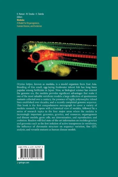 Oryzias latipes, known as medaka, is a model organism from East Asia. Breeding of this small, egg-laying freshwater teleost fish has long been popular among hobbyists in Japan. Now, as biological science has entered the genome era, the medaka provides significant advantages that make it one of the most valuable vertebrate models: a large collection of spontaneous mutants collected over a century, the presence of highly polymorphic inbred lines established over decades, and a recently completed genome sequence. This book is the first comprehensive monograph to cover a variety of medaka research. It opens with a historical view of medaka, followed by a series of research topics in the four major areas where the medaka is increasingly important: genomics, genetics, and resources; organogenesis and disease models; germ cells, sex determination, and reproduction; and evolution. Readers will find state-of-the-art information on medaka genetics and genomics such as the first isolation of active transposons in vertebrates, the influence of chromatin structure on sequence variation, fine QTL analysis, and versatile mutants as human disease models.