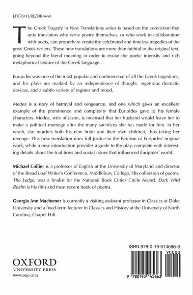 This is a new translation in verse of Medea by a well-regarded poet with an introduction and notes by a scholar of Euripides. The result is a distinguished edition of a canonical play, one of the most widely read and performed of all the Greek dramas.