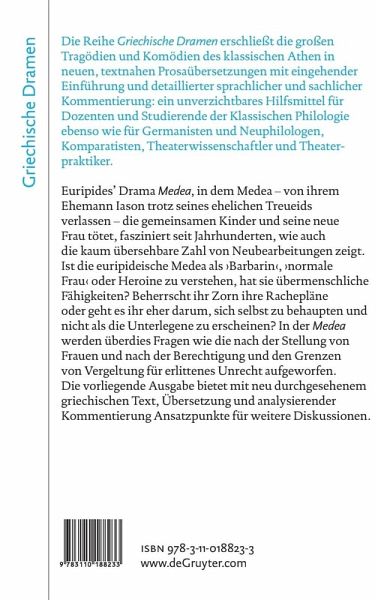 Die vorliegende Ausgabe der Medea des Euripides bietet eine ausführliche Einführung, einen neu durchgesehenen griechischen Text (mit sprachlichen Erklärungen), eine deutsche Prosaübersetzung und einen detaillierten Kommentar zu sprachlichen und sachlichen Problemen, für dessen Verständnis die Kenntnis des Griechischen nicht erforderlich ist. Sie entspricht damit den Intentionen der Reihe, griechische Dramen einem größeren Rezipientenkreis mit unterschiedlichen Interessen zugänglich zu machen. Die Textgestaltung und durchgängige Kommentierung erforderten auch eine eingehende Auseinandersetzung mit spezifisch fachwissenschaftlichen Diskussionen, insbesondere in Bezug auf die bei dem Medea-Text besonders relevanten Fragen der Echtheit einzelner Textpartien. Dazu werden Hypothesen vorgeschlagen, die Konsequenzen für den Ablauf der Handlung und für das Verständnis der Darstellung von Medeas Racheplanung und ihrer Motivierung haben. Auch für die Frage, ob Euripides, wie zumeist angenommen, der erste war, der Medea ihre Kinder absichtlich töten lässt, ergeben sich durch weitere Überlegungen zu dem Verhältnis der euripideischen Medea zur sog. Ur-Medea und zur Medea des Neophron neue Aspekte.