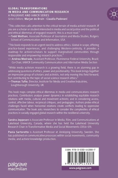 1. Introduction: Mapping Questions of Power and Ethics in Media Activist Research Practices.- 2. Research Ethics: Critical Reflections on Horizontal Media Activism Research Practices.- 3. Dealing with Ethical Dilemmas in Activist Research on Social Movement Media.- 4. Challenges for Social movement Research in the Context of Inequality: The MST in Brazil.- 5. Denaturalizing Research Practices: (Re)signifying subject positions through decolonial theories.- 6. Disrupting Settler Colonialism and Oppression in Media and Policy-Making: A view from the Community Media Advocacy Centre.- 7. Wearing Multiple Reflexive Hats: The ethical complexities of media-oriented Community Engaged Learning.- 8. The Ethics of Reciprocal Communication.- 9. Researcher Ethics: Between Axiological Reasoning and Scientific Discussion.- 10. Difficult Choices: Application of Feminist Ethics of Care in Action Research.- 11. The Ethics of Media Research with Refugees.- 12. Challenges of Ongoing Conflict Research: Dialogic autoethnography in studies of post-2014 Ukraine.