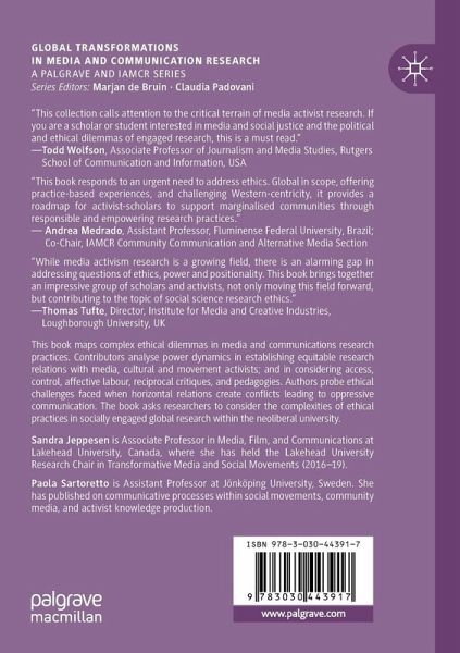 1. Introduction: Mapping Questions of Power and Ethics in Media Activist Research Practices.- 2. Research Ethics: Critical Reflections on Horizontal Media Activism Research Practices.- 3. Dealing with Ethical Dilemmas in Activist Research on Social Movement Media.- 4. Challenges for Social movement Research in the Context of Inequality: The MST in Brazil.- 5. Denaturalizing Research Practices: (Re)signifying subject positions through decolonial theories.- 6. Disrupting Settler Colonialism and Oppression in Media and Policy-Making: A view from the Community Media Advocacy Centre.- 7. Wearing Multiple Reflexive Hats: The ethical complexities of media-oriented Community Engaged Learning.- 8. The Ethics of Reciprocal Communication.- 9. Researcher Ethics: Between Axiological Reasoning and Scientific Discussion.- 10. Difficult Choices: Application of Feminist Ethics of Care in Action Research.- 11. The Ethics of Media Research with Refugees.- 12. Challenges of Ongoing Conflict Research: Dialogic autoethnography in studies of post-2014 Ukraine.