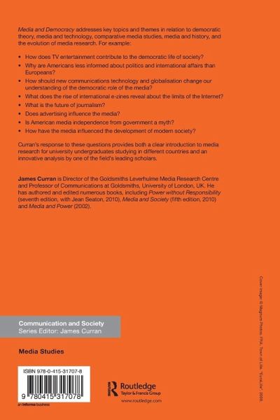 Media and Democracy addresses key topics and themes in relation to democratic theory, media and technology, comparative media studies, media and history, and the evolution of media research. For example: How does TV entertainment contribute to the democratic life of society? Why are Americans less informed about politics and international affairs than Europeans? How should new communications technology and globalisation change our understanding of the democratic role of the media? What does the rise of international ezines reveal about the limits of the internet? What is the future of journalism? Does advertising influence the media? Is American media independence from government a myth? How have the media influenced the development of modern society? Professor Curran's response to these questions provides both a clear introduction to media research, written for university undergraduates studying in different countries, and an innovative analysis written by one of the field's leading scholars.