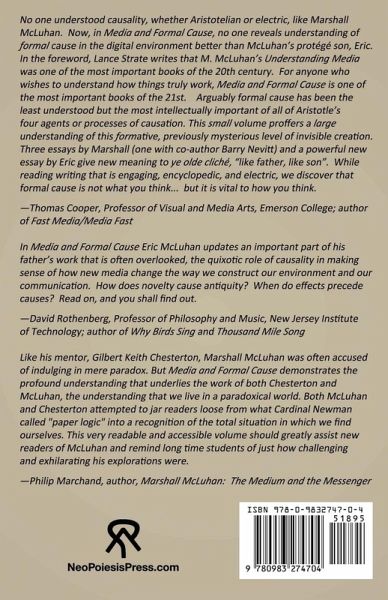 Reviews No one understood causality, whether Aristotelian or electric, like Marshall McLuhan. Now, in Media and Formal Cause, no one reveals understanding of formal cause in the digital environment better than McLuhan's protégé son, Eric. In the foreword, Lance Strate writes that M. McLuhan's Understanding Media was one of the most important books of the 20th century. For anyone who wishes to understand how things truly work, Media and Formal Cause is one of the most important books of the 21st. Arguably formal cause has been the least understood but the most intellectually important of all of Aristotle's four agents or processes of causation. This small volume proffers a large understanding of this formative, previously mysterious level of invisible creation. Three essays by Marshall (one with co-author Barry Nevitt) and a powerful new essay by Eric give new meaning to ye olde cliché, "like father, like son". While reading writing that is engaging, encyclopedic, and electric, we discover that formal cause is not what you think... but it is vital to how you think. -Thomas Cooper, Professor of Visual and Media Arts, Emerson College; author of Fast Media/Media Fast In Media and Formal Cause Eric McLuhan updates an important part of his father's work that is often overlooked, the quixotic role of causality in making sense of how new media change the way we construct our environment and our communication. How does novelty cause antiquity? When do effects precede causes? Read on, and you shall find out. -David Rothenberg, Professor of Philosophy and Music, New Jersey Institute of Technology; author of Why Birds Sing and Thousand Mile Song Like his mentor, Gilbert Keith Chesterton, Marshall McLuhan was often accused of indulging in mere paradox. But Media and Formal Cause demonstrates the profound understanding that underlies the work of both Chesterton and McLuhan, the understanding that we live in a paradoxical world. Both McLuhan and Chesterton attempted to jar readers loose from what Cardinal Newman called "paper logic" into a recognition of the total situation in which we find ourselves. This very readable and accessible volume should greatly assist new readers of McLuhan and remind long time students of just how challenging and exhilarating his explorations were. -Philip Marchand, author, Marshall McLuhan: The Medium and the Messenger A sage and perceptive quartet of essays which capture and extend a still quintessentially unique way of thinking about media, via patterns and connections that harken to the ancient world and redound to our present and future. -Paul Levinson, Professor of Communication and Media Studies, Fordham University; author of Digital McLuhan, and of New New Media