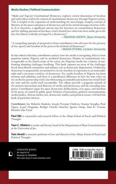 Table of Contents Acknowledgments Chapter 1: Introduction Paul Obi, Taye C. Obateru and Sam Amadi Chapter 2: Assessing the Legal Protection of Freedom of the Press in Nigeria's Constitutional Democracy Sam Amadi Chapter 3: Media Censorship of Nigerian Presidential Elections: Navigating Candidates, Campaigns and the Monitory Democracy Theory Paul Obi Chapter 4: Who Watches the Watchdog? Ethical Interrogation of Self-Censorship of Nigerian Media Taye C. Obateru Chapter 5: The Shrinking Civic Space: Journalistic Hazards, Risks and Media Resistance to Censorship in Nigeria Bridget Onochie, Lasisi Olagunju, Paul Ogwu and Paul Obi Chapter 6: National Broadcasting Commission (NBC), Nigerian Press Council (NPC) and Media Regulation in an Age of Information Fluidity Igomu Onoja Chapter 7: Walking the Tight Rope of National Security: Interrogating Public Interest to Know vs Security Implications of Media Coverage Ibrahim Uba Yusuf, Senator Iroegbu and Brigadier General Sani K. Usman (Rtd) Chapter 8: