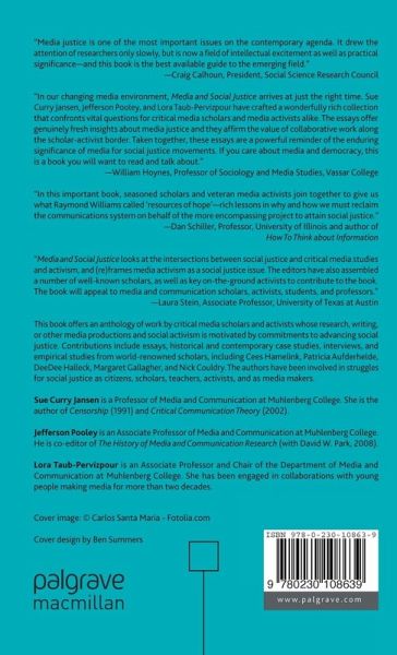 "In our changing media environment, Media and Social Justice arrives at just the right time. Sue Curry Jansen, Jefferson Pooley, and Lora Taub-Pervizpour have crafted a wonderfully rich collection that confronts vital questions for critical media scholars and media activists alike. The essays offer genuinely fresh insights about media justice and they affirm the value of collaborative work along the scholar-activist border. Taken together, these essays are a powerful reminder of the enduring significance of media for social justice movements. If you care about media and democracy, this is a book you will want to read and talk about." - William Hoynes, Professor of Sociology and Media Studies, Vassar College"In this important book, seasoned scholars and veteran media activists join together to give us what Raymond Williams called resources of hope - rich lessons in why and how we must reclaim the communications system in behalf of the more encompassing project to attain social justice." - Dan Schiller, Professor,University of Illinois and author of How To Think about Information"This book looks at the intersections between social justice and critical media studies and activism, and (re)frames media activism as a social justice issue.The editors have also assembled a number of well-known scholars, as well as key on-the-ground activists to contribute to the book. The book will appeal to media and communication scholars, activists, students, and professors." - Laura Stein, Associate Professor, University of Texas at Austin