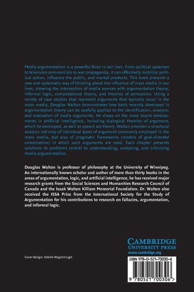 Media argumentation is a powerful force in our lives. From political speeches to television commercials to war propaganda, it can effectively mobilize political action, influence the public, and market products. This book presents a new and systematic way of thinking about the influence of mass media in our lives, showing the intersection of media sources with argumentation theory, informal logic, computational theory, and theories of persuasion. Using a variety of case studies that represent arguments that typically occur in the mass media, Douglas Walton demonstrates how tools recently developed in argumentation theory can be usefully applied to the identification, analysis, and evaluation of media arguments. He draws upon the most recent developments in artificial intelligence, including dialogical theories of argument, which he developed, as well as speech act theory. Each chapter presents solutions to problems central to understanding, analyzing, and criticizing media argumentation.