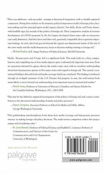 "Media, Bureaucracies, and Foreign Aid is a significant book. This study looks in a clear, comprehensive and compelling way at how media impacts upon a substantively important issue area. From an exposition informed by agency theory, the reader comes away with an excellent understanding about how bureaucracies operate in five major states with regard to foreign aid. The central, cross-national finding is that aid levels and media coverage clearly are correlated. This finding is reinforced through an in-depth treatment of the U.S. Disaster Aid program. In sum, this well-written book seems likely to move forward ourunderstanding of an important issue in international studies." - Patrick James, Professor at University of Missouri, Columbia, and Senior Scholar for the Canadian Embassy, Washington, DC, 2003-04