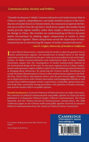 In most liberal democracies commercialized media is taken for granted, but in many authoritarian regimes the introduction of market forces in the media represents a radical break from the past with uncertain political and social implications. In Media Commercialization and Authoritarian Rule in China, Daniela Stockmann argues that the consequences of media marketization depend on the institutional design of the state. In one-party regimes such as China, market-based media promote regime stability rather than destabilizing authoritarianism or bringing about democracy. By analyzing the Chinese media, Stockmann ties trends of market liberalism in China to other authoritarian regimes in the Middle East, North Africa, sub-Saharan Africa and the post-Soviet region. Drawing on in-depth interviews with Chinese journalists and propaganda officials as well as more than 2000 newspaper articles, experiments and public opinion data sets, this book links censorship among journalists with patterns of media consumption and the media's effects on public opinion.