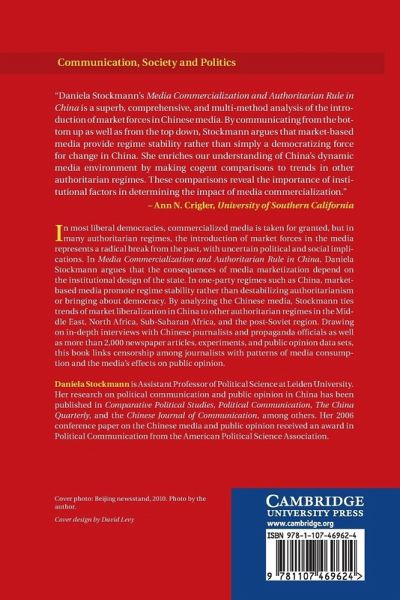 In most liberal democracies commercialized media is taken for granted, but in many authoritarian regimes the introduction of market forces in the media represents a radical break from the past with uncertain political and social implications. In Media Commercialization and Authoritarian Rule in China, Daniela Stockmann argues that the consequences of media marketization depend on the institutional design of the state. In one-party regimes such as China, market-based media promote regime stability rather than destabilizing authoritarianism or bringing about democracy. By analyzing the Chinese media, Stockmann ties trends of market liberalism in China to other authoritarian regimes in the Middle East, North Africa, sub-Saharan Africa and the post-Soviet region. Drawing on in-depth interviews with Chinese journalists and propaganda officials as well as more than 2000 newspaper articles, experiments and public opinion data sets, this book links censorship among journalists with patterns of media consumption and the media's effects on public opinion.
