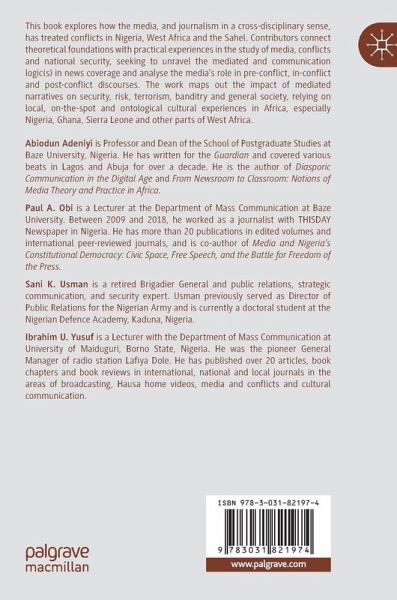 This book explores how the media, and journalism in a cross-disciplinary sense, has treated conflicts in Nigeria, West Africa and the Sahel. Contributors connect theoretical foundations with practical experiences in the study of media, conflicts and national security, seeking to unravel the mediated and communication logic(s) in news coverage and analyse the media's role in pre-conflict, in-conflict and post-conflict discourses. The work maps out the impact of mediated narratives on security, risk, terrorism, banditry and general society, relying on local, on-the-spot and ontological cultural experiences in Africa, especially Nigeria, Ghana, Sierra Leone and other parts of West Africa.
