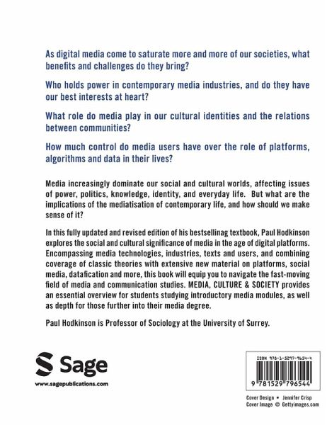 * As digital media come to saturate more and more of our societies, what benefits and challenges do they bring? * Who holds power in contemporary media industries, and do they have our best interests at heart? * What role do media play in our cultural identities and the relations between communities? * How much control do media users have over the role of platforms, algorithms and data in their lives? Media increasingly dominate our social and cultural worlds, affecting issues of power, politics, knowledge, identity, and everyday life. But what are the implications of the mediatisation of contemporary life, and how should we make sense of it? In this fully updated and revised edition of his bestselling textbook, Paul Hodkinson explores the social and cultural significance of media in the age of digital platforms. Encompassing media technologies, industries, texts and users, and combining coverage of classic theories with extensive new material on platforms, social media, datafication and more, this book will equip you to navigate the fast-moving field of media and communication studies. Media, Culture and Society provides an essential overview for students studying introductory media modules, as well as depth for those further into their media degree.
