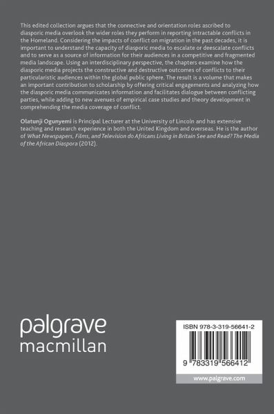 This edited collection argues that the connective and orientation roles ascribed to diasporic media overlook the wider roles they perform in reporting intractable conflicts in the Homeland. Considering the impacts of conflict on migration in the past decades, it is important to understand the capacity of diasporic media to escalate or deescalate conflicts and to serve as a source of information for their audiences in a competitive and fragmented media landscape. Using an interdisciplinary perspective, the chapters examine how the diasporic media projects the constructive and destructive outcomes of conflicts to their particularistic audiences within the global public sphere. The result is a volume that makes an important contribution to scholarship by offering critical engagements and analyzing how the diasporic media communicates information and facilitates dialogue between conflicting parties, while adding to new avenues of empirical case studies and theory development in comprehending the media coverage of conflict.