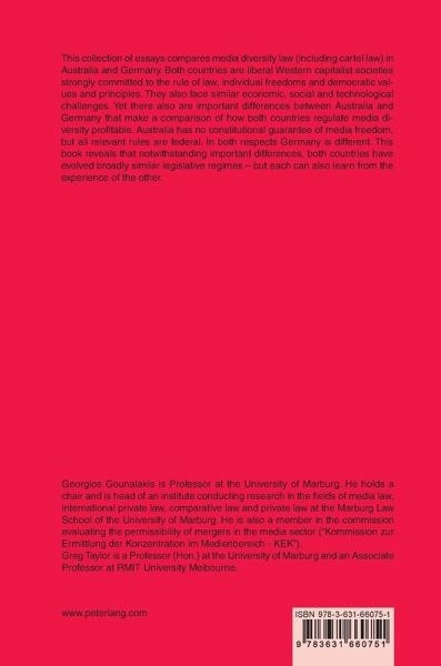 Contents: Georgios Gounalakis/Simon Röß: Cross media ownership: A comparison of the legal framework of Australia and Germany - Sharon Rodrick: Regulating media diversity in Australia: Where to next? - Eric Windholz: Regulating for Broadcasting Diversity: Balancing Economic and Social Values in the Public Interest - Romy Nicole Fleischer: Antitrust Regulation, Innovation and Dynamic Competition in the Internet sector with particular focus on unilateral market behaviour of online platforms - Michael Kling: Media diversity and competition law: Merger control in the print media sector - John Duns: Media diversity and the role of competition law - Greg Taylor: Diversity within government broadcasters - Justin Malbon: Geo-Pricing of Digital Media: European and Australian Policy Debates Compared.