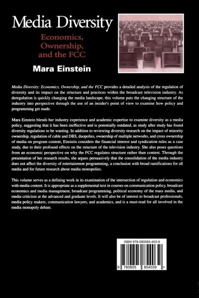 Media Diversity: Economics, Ownership, and the FCC provides a detailed analysis of the regulation of diversity and its impact on the structure and practices within the broadcast television industry. As deregulation is quickly changing the media landscape, this volume puts the changing structure of the industry into perspective through the use of an insider's point of view to examine how policy and programming get made. Author Mara Einstein blends her industry experience and academic expertise to examine diversity as a media policy, suggesting that it has been ineffective and is potentially outdated, as study after study has found diversity regulations to be wanting. In addition to reviewing diversity research on the impact of minority ownership, regulation of cable and DBS, duopolies, ownership of multiple networks and cross ownership of media on program content, Einstein considers the financial interest and syndication rules as a case study, due to their profound effects on the structure of the television industry. She also poses questions from an economic perspective on why the FCC regulates structure rather than content. Through the presentation of her research results, she argues persuasively that the consolidation of the media industry does not affect the diversity of entertainment programming, a conclusion with broad ramifications for all media and for future research about media monopolies. This volume serves as a defining work in its examination of the intersection of regulation and economics with media content. It is appropriate as a supplemental text in courses on communication policy, broadcast economic and media management, broadcast programming, political economy of the mass media, and media criticism at the advanced and graduate level. It is also likely to interest broadcast professionals, media policymakers, communication lawyers, and academics. It is a must-read for all who are interested in the media monopoly debate.
