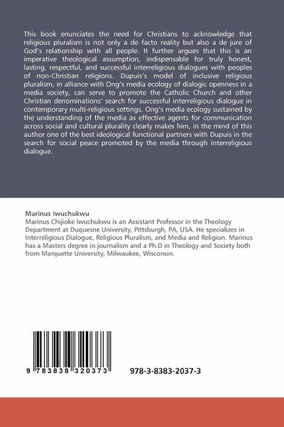 This book enunciates the need for Christians to acknowledge that religious pluralism is not only a de facto reality but also a de jure of God s relationship with all people. It further argues that this is an imperative theological assumption, indispensable for truly honest, lasting, respectful, and successful interreligious dialogues with peoples of non-Christian religions. Dupuis s model of inclusive religious pluralism, in alliance with Ong s media ecology of dialogic openness in a media society, can serve to promote the Catholic Church and other Christian denominations search for successful interreligious dialogue in contemporary multi-religious settings. Ong s media ecology sustained by the understanding of the media as effective agents for communication across social and cultural plurality clearly makes him, in the mind of this author one of the best ideological functional partners with Dupuis in the search for social peace promoted by the media through interreligious dialogue.