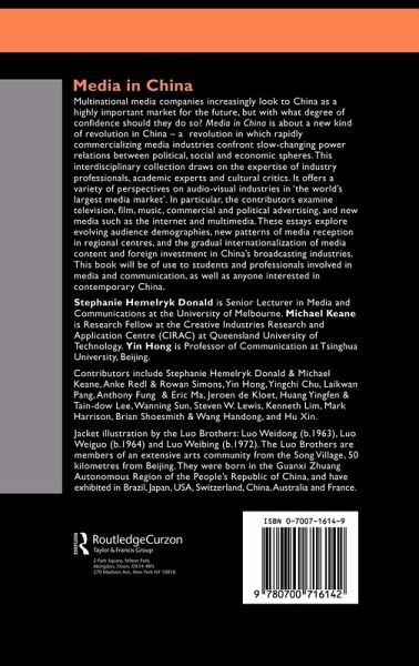 Stephanie Hemelryk Donald is Senior lecturer in Media and communications at the University of Melbourne. Research interests include children and the media in China, film cultures and visual politics in the Asian region. Michael Keane is Research Fellow at the Creative Industries Research and Applications Centre at Queensland (CIRAC) University of Technology. His PhD. dissertation (1999) discussed policy and Chinese domestic television drama development in the 1990s. Research interests are media governance, and television format trade and creative industry developments in East Asia. Yin Hong is Professor in the Department of Communication, Tsinghua University, Beijing, China.
