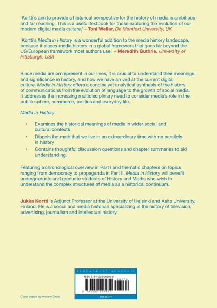 Since media is omnipresent in our lives, it is crucial to understand the complex means and dimensions of media in history, and how we have arrived at the current digital culture. Media in History addresses the increasing multidisciplinary need to comprehend the meanings and significances of media development through a variety of different approaches. Providing a concise, accessible and analytical synthesis of the history of communications, from the evolution of language to the growth of social media, this book also stresses the importance of understanding wider social and cultural contexts. Although technological innovations have created and shaped media, Kortti examines how politics and the economy are central to the development of communication. Media in History will benefit undergraduate and graduate history and media studies students who want to understand the complex structures of media as a historical continuum and to reflect on their own experiences with that development.