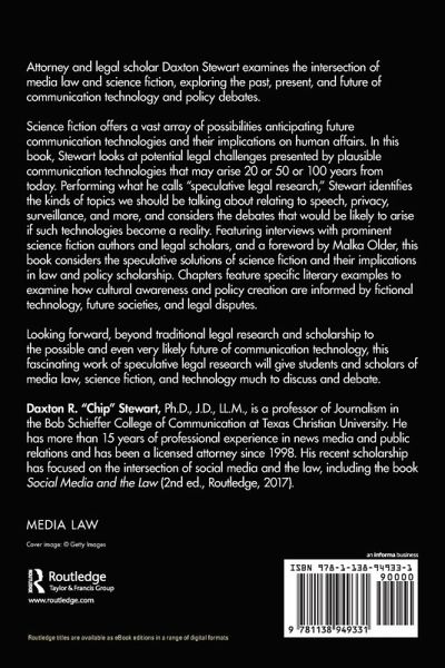 Attorney and legal scholar Daxton Stewart examines the intersection of media law and science fiction, exploring the past, present, and future of communication technology and policy debates. In this book, Stewart looks at potential legal challenges presented by plausible communication technologies that may arise in the future.
