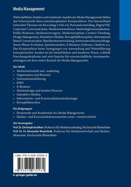 Wirtschaftliche, kreative und technische Aspekte des Media Managements bilden den Schwerpunkt dieses interdisziplinären Kompendiums. Der Sammelband beleuchtet Themen wie Recruiting 1.0 bis 4.0, Personalcontrolling, Digital HR, Corporate Communication, Medienunternehmer, Marketingkommunikation, Public Relations, Medienkonvergenz, Medienrezeption, Creative Thinking, Design Management, Interaktive Medien, Bewegtbildkonzeption, International Brand Communication, Bandbreitenentwicklung, Internetanschlussnachfrage, Smart-Phone-Evolution, Speichermedien, E-Business-Software, Chatbots u.a. Das Kompendium bietet Anregungen zur Anwendung und Weiterführung konzeptioneller Ansätze in der betrieblichen und kreativen Praxis, schließt Forschungsdesiderate und setzt Impulse für wissenschaftliche Auseinandersetzungen mit dem weiten Bereich des Media Managements.