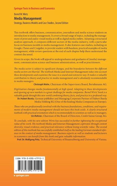 "Digitalization significantly changes the media. To cope with this change and to exploit new market opportunities is a major challenge for media corporations. Bernd Wirtz provides a valuable guideline for this new world, combining theory, facts, and practice."