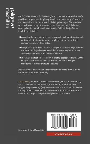 Media Nations: Communicating Belonging and Exclusion in the Modern World provides an original interdisciplinary introduction to the study of the media and nationalism in the modern world. Building on a range of international case studies and taking into account recent debates about globalization, cosmopolitanism and alternative modernities, Sabina Mihelj offers an insightful analysis that: n argues for the continuing relevance of concepts such as nationalism and national identity in understanding the global patterns of mediated communication and identification n bridges the gap between text-based analysis of national imagination and the more sociological concerns with the impact of media institutions and the broader political and economic context n challenges the tacit ethnocentrism of existing debates, and opens up the study of nationalism and mass communication to the multiple trajectories of modernity around the globe Media Nations is an important and timely contribution to debates on the media, nationalism and modernity. Sabina Mihelj has worked and studied in Slovenia, Hungary, and Germany, and is currently a Lecturer in Media, Communication and Culture at Loughborough University, (UK). Her research centres on issues of collective identity formation and mass communication, with particular reference to nationalism, European integration, religion and communism.