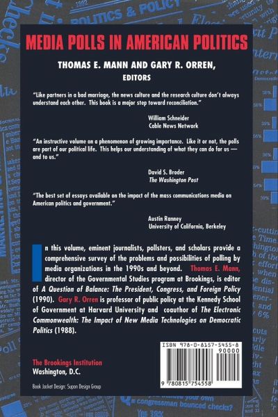 " Public opinion pools have become staples of contemporary political reporting, and most national news organizations have sophisticated in-house polling operations. The increased number and quality of polls conducted and reported by the press give the public a chance to help see the agendas of campaigns and define the meaning of elections. Yet competition and the need for fast responses to events often lead news organizations to misuse polls in a way that diminishes rather than enhances democracy. Polls can shape public opinion as well as describe it; they can set the news agenda and influence the coverage of political events in ways hostile to a constructive dialogue between citizens and their leaders. In this volume, media specialist and well-known reporters provide a comprehensive survey of the problems and possibilities of polling by media organizations in the 1990s and beyond. Thomas Mann and Gary Orren analyze the strengths and weaknesses of media polls and their impact on American politics. Everett Carll Ladd and John Benson discuss the extraordinary growth of polling in news organizations for the past two decades. Kathleen Frankovic addresses the tension between the needs of news organizations for quick results and the need to preserve the standards of survey research. Henry Brady and Gary Orren examine the most serious methodological problems with news media polls. Michael Kagay explores the sources of well-publicized variability in poll findings. Michael Traugott considers the complicated question of how polls influence the public and whether their effects are benign or harmful. Finally, E. J. Dionne, Jr. examines media organizations' obsession with polls and the impact polls have on reporters. The authors offer recommendations for improving the conduct and use of media polls so that citizens can make better informed and enlightened decisions about the public agenda."